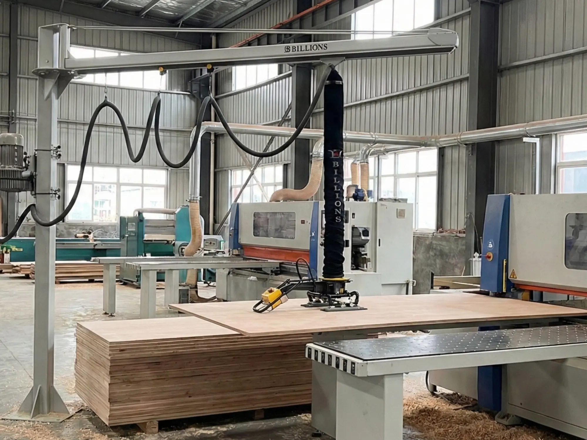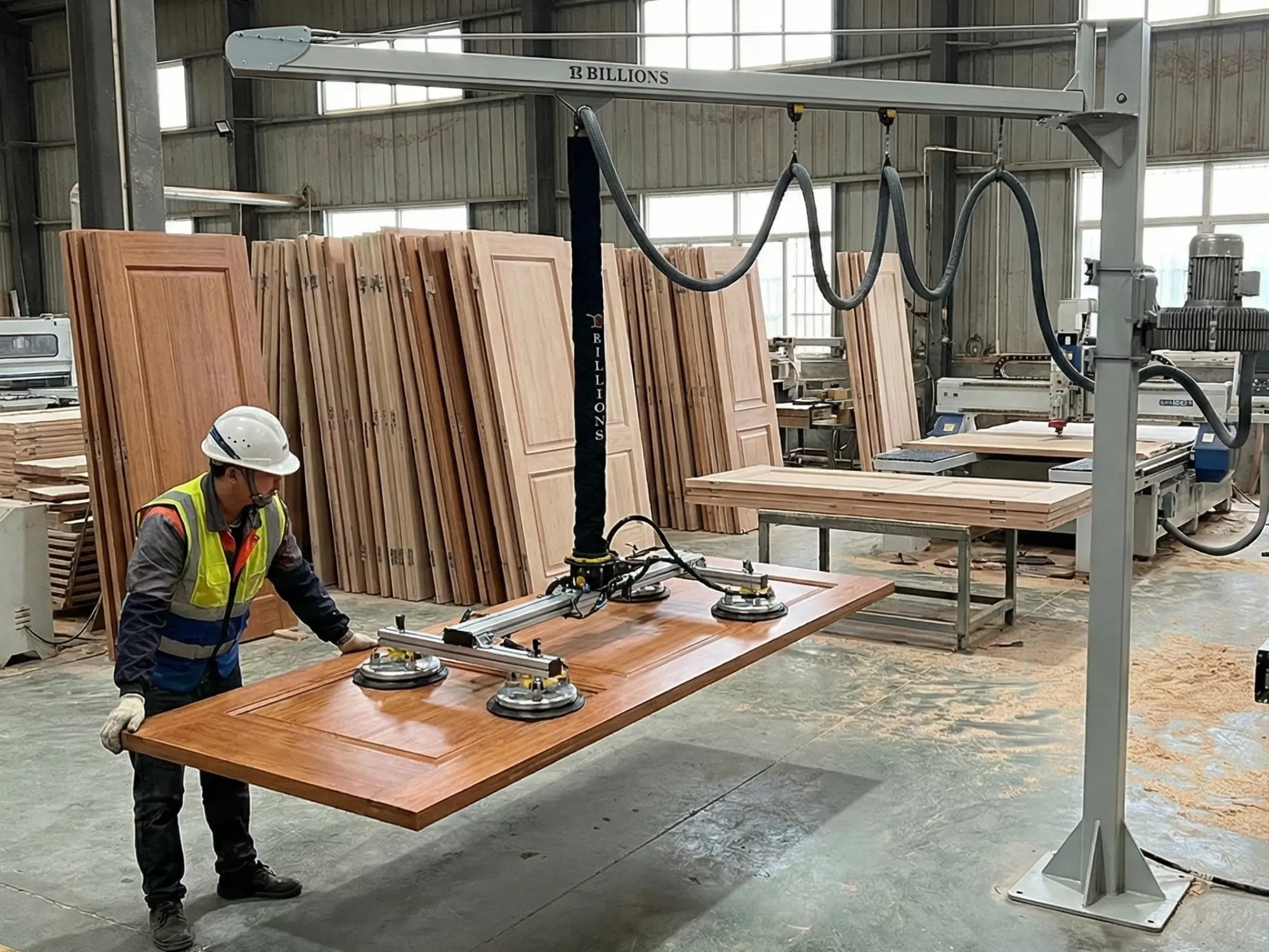 BILLIONS LIFTER® vacuum lifting systems integrate into woodworking, furniture, door manufacturing, stone processing, and panel production workflows to improve safety, speed, and material protection.